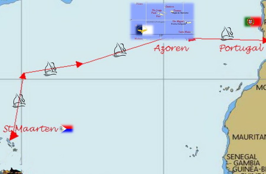 Het vertrek punt zal Sint Maarten of Antigua zijn om naar de welbekende Azoren archipel te zeilen wat ongeveer 2500 Nm is. We hopen dat in minder dan 21 dagen te doen. De eerste planning was om het voor ons nog onbekende, meest westelijke eiland Flores aan te lopen. Echter de winterstormen van 2018-2019, hebben de marina totaal verwoest achter gelaten. Wat nu het aanlooppunt wordt is afhankelijk van het weer en de omstandigheden van schip en bemanning en de mogelijkheden i.v.m. de wereldwijde pandemie Corona..